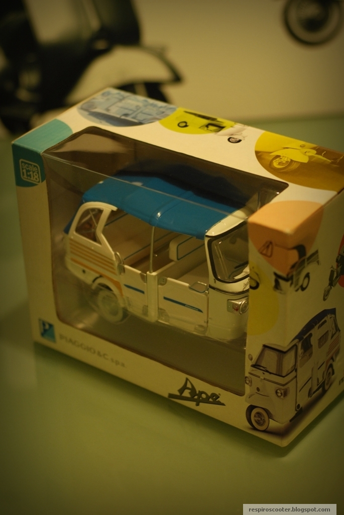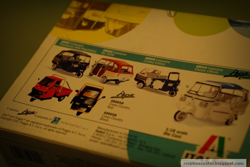 É uma miniatura da Italeri para a Piaggio, e tem até uma versão Presidenza della Repubblica. A que adquiri é a branca, ou seja, a versão Electric Lithium. Comprei na Giocattoli, um clássico romano do comércio de modelismo que tive oportunidade de revisitar. Curiosamente, estava também disponível na loja o Ape de competição que também consta da caixa do meu Calessino, mas nem sequer aparece no site da Italeri. De entre as duas optei pelo Calessino, em troca de vinte e três euros. Obviamente devia ter trazido os dois.