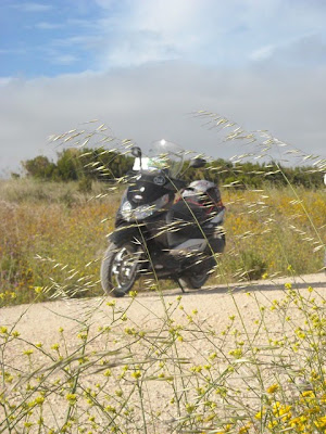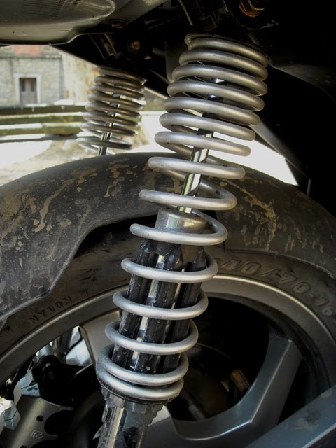 O comportamento beneficia da conjugação de uma suspensão com o equilíbrio certo entre conforto e rigidez e um motor bem centrado no quadro, o que assegura uma boa distribuição de massas, se não perdermos de vista que se trata de uma scooter. As jantes de dezasseis polegadas permitem-lhe passar por buracos e desníveis na estrada com uma compostura impossível de reproduzir numa scooter de roda baixa. Absorve muito bem as irregularidades e digere com surpreendente eficácia andamentos mais exigentes, como sucessões intermináveis de curvas de raio apertado, ou curvas longas em auto-estrada em velocidades muito para além do limite legal. Sempre tão à vontade como a ziguezaguear entre filas de trânsito no centro de Faro!
