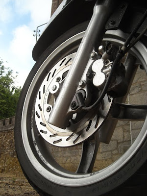 Para refrear estes ritmos contei com excelentes travões, apenas um disco à frente e outro na traseira, mas ambos incansáveis mesmo quando os tentei fatigar para lá do razoável.