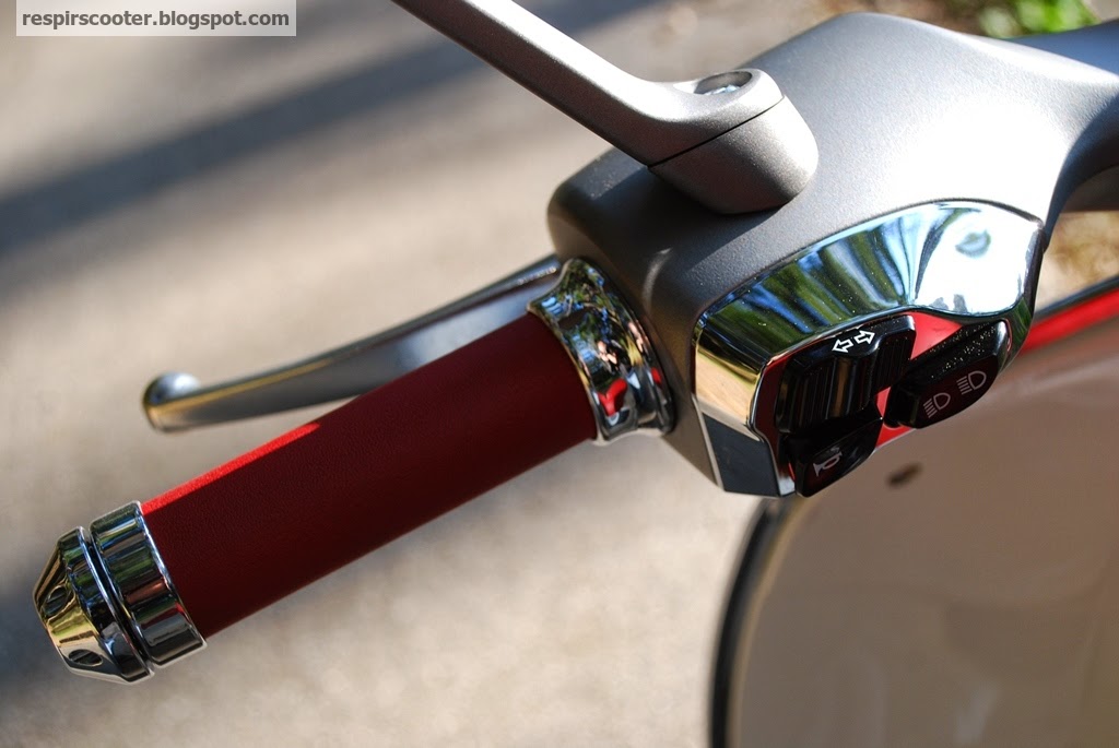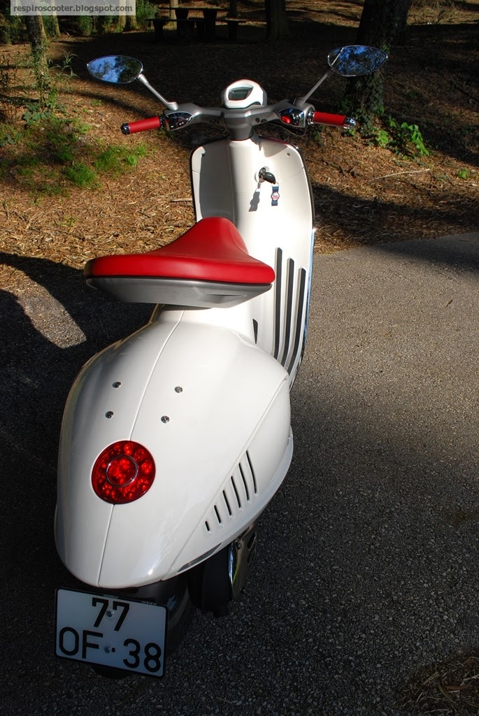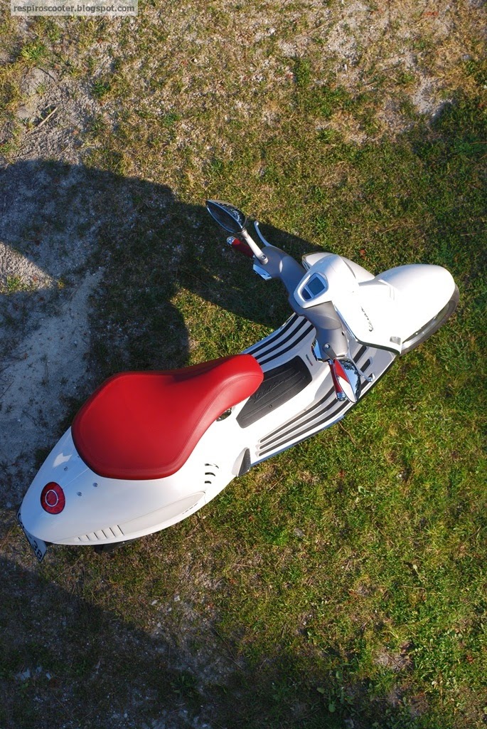 Os punhos são macios e de toque luxuoso, os espelhos têm um desenho elegante e boa visibilidade, e a posição de condução e ergonomia é quase perfeita para a minha estatura (1,70m). Preferiria o banco ligeiramente mais baixo, como está fica um pouco mais alto do que o da minha GTS, mas não o suficiente para incomodar em manobras na cidade. A forma do banco é original, mas suficientemente confortável para viagens curtas, e permite mesmo amplitude de movimentos ao condutor. Com dois ocupantes - não experimentei - a história pode ser outra, mas suspeito que convirá que o namoro seja recente para resistir à exiguidade do espaço sem amuos.