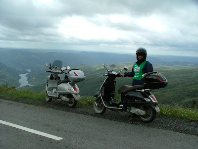 Embora apreensivos pela extensão do primeiro dia de ligação, reina a boa disposição e o optimismo. Já são algumas semanas de preparativos, sendo que a Vespa do Júlio sofreu várias intervenções ao nível do posto de comando que a tornaram mais talhada para estas lides: leitor de road-book, fundamental para nos mantermos no percurso, conta-quilómetros de ciclismo, ideal para leituras parciais, GPS, que se revelou inútil. Tudo com os respectivos suportes. Parece uma Vespa da NASA! Por contraste, a minha GT ostenta a sua silhueta pura e esbelta, sem apetrechos espaciais, apenas um flyscreen original adquirido a contra gosto, mas cuja utilidade fui podendo comprovar na estrada.