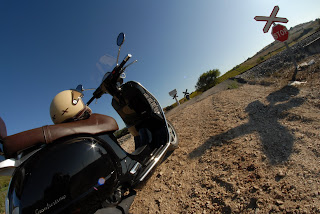 Desde logo porque os gregos têm uma altíssima taxa de incumprimento das mais elementares regras de trânsito, como nunca vi na Europa. A começar no obrigatório uso do capacete, cerca de metade dos condutores ou não o usam, ou levam-no no cotovelo. Quando levantei a scooter tive que pedir um, porque o funcionário não mo daria se o não pedisse. Um sentido proibido é desrespeitado com enorme facilidade, ninguém pára numa passadeira, é muito frequente ver motos a circular nos passeios perante a passividade da polícia, não se vê quem respeite limites de velocidade.