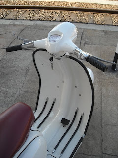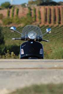 Assim que a estrada se me depara livre experimento pegar algum fogo à peça, explorando outros territórios sensoriais. Estico a segunda e o empurrão obriga-me a agarrar com decisão os dois punhos. Clank, terceira. O som do dois tempos é inebriante, a agulha do velocímetro italiano salta, em esticões alucinados, entre os 60 e os 110kms/h, a scooter vibra como uma cana de pesca com isco mordido. A terceira é longa… Ainda vou em terceira. Ainda está a subir regime, mas começo a temer pelo grupo térmico e clank!, quarta! Ainda não vejo o fim da longa recta, o motor grita-me ao ouvido e ainda está a reclamar mais ar, mais gasolina, mais velocidade. Nesta altura juro que me enganei a ler a ficha técnica, não pode ter só 11cv às 6200rpm. Entretanto vem-me ao espírito que a SX tem travões de tambor. Como serão eles a esta velocidade ? Pois, são bastante macios, em total contraste com a agressividade do motor. Na realidade, são abrandadores. Confesso que também não me adaptei convenientemente ao travão traseiro, demasiado à esquerda na plataforma e “fora de pé”. Felizmente que a caixa é intuitiva no trato e o travão-motor uma delícia, bem ao meu gosto, livre de inércia. O amortecimento é também muito brando à frente e apenas regular atrás, embora se possa considerar suficiente se atendermos ao contexto histórico. Em curva não perde a compostura, desde que não seja necessário o recurso ao travão frontal. Os pneus contemporâneos montados nesta SX ajudam – e muito - a disfarçar as naturais insuficiências neste capítulo.